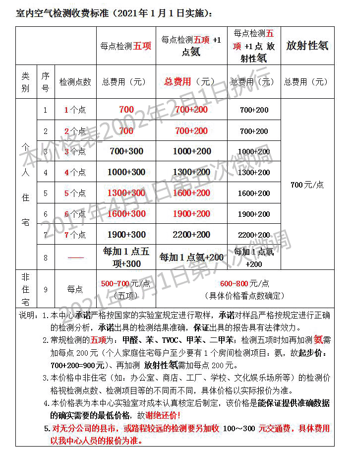 另:地板检测(包括各种复合地板检测): 7.㈢、以上价格仅限个人家庭住宅内的空气检测;对无分公司的县市上门检测一律另加收 100~300 元交通费,具体费用视情形而定。 7.㈣、办公室、商店、工厂、学校、文化娱乐场所等的检测价格视检测点数、检测项目等的不同而不同,具体价格需视现场实际情形而定。 7.㈤、我中心人员上门采完样,签好合同后,我们收取全部检测费用,以利我们第3天告知检测结果。 7.㈥、特别提醒:由于进行空气检测采样用的吸收液均要求当天在实验室现配,该吸收液隔夜即失效(不允许再使用),为加强成本控制,本实验室每天一律不多配该吸收液,故当我们采样人员上门后您不能再要求增加采样点数,对要求减少采样点数的客户,一律加收样品损失费,1个采样点的吸收液加收50元整损失费;例如:你和我中心确定好做4个点(5项指标,共1300元),现场你改做3个点(5项指标),你应付1000+50=1050元。 7.㈦、对单位三废、单位废水、单位废气、单位噪声、单位环境检测等,麻烦你把贵单位的①单位名称、②单位地址(如果检测地址和单位地址不同,麻烦也写上检测地址)、③联系人及联系人的联系电话,最好写上联系人的手机号码、④要检测的项目(尽量详细)等发到我中心检测业务邮箱:jshjjc@163.com,我们收到邮件后会给你报价;当然你发完邮件后最好再打给电话告诉我一下,谢谢理解! ■ 8. 封闭过程及检测过程中不准开空调和换气扇(中央空调和客户特别要求除外,但必须记录在案)。 ■ 9. 封闭过程和检测过程中不要进行影响测试结果的活动,如吸烟和用燃气灶等。 ■ 10. 检测现场需清理干净,不能堆放残余的涂料、油漆、板材等。 ■ 11. 封闭过程和检测过程中不要使用化工产品,如空气清新剂,香水等等。 ■ 12. 检测过程中每个房间的门尽量相互关闭,不要保持通风。 ■ 13. 人员进行室内环境检测前,您应要求检测人员出示相应的职业资格证书,并核实该证书上的照片是否为其本人,否则您可以拒绝该检测人员进行检测。 ■ 14. 检测过程中检测人员和其他人员共计人数最好不得超过 3人,尽量减少人员活动对检测的影响。 ■ 15. 上门进行空气采样耗时:每个检测点采样耗时约 25分钟, 3个检测点采样耗时约 75分钟, 4个检测点耗时约 100分钟。 ■ 16. 出具报告时间:自取样之日始,第 5个工作日左右提供 CMA报告,如客户确有需要,可提前约一天电话告知检测结果。 ■ 17. 根据检验报告结果,本公司针对每户的实际情况有针对性的出具一份室内环境污染评价建议。 ■ 18.友情提醒:由于现在市场上喷洒化学药剂的治理办法没有任何国际标准或行业标准,对治理用的药剂是什么成分无法知道,对药剂本身是否有污染无法确定,对治理后是否产生新的污染物(该新的污染物可能现在我们还没有发现,或该污染物现人们知道但不知道是哪种)也无法知晓,故现在我们不推荐进行使用化学药剂的任何治理方法。不能进行化学治理的原因,详:点击进入 >> |