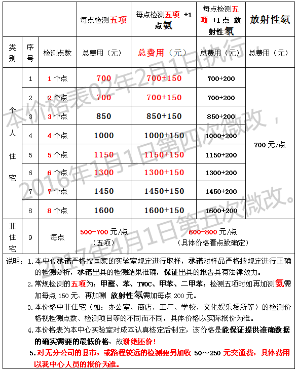 另:地板检测(包括各种复合地板检测): 7.㈢、以上价格仅限个人家庭住宅内的空气检测;对无分公司的县市上门检测一律另加收 50~250 元交通费,具体费用视情形而定。 7.㈣、办公室、商店、工厂、学校、文化娱乐场所等的检测价格视检测点数、检测项目等的不同而不同,具体价格需视现场实际情形而定。 7.㈤、我中心人员上门采完样,签好合同后,我们收取全部检测费用,以利我们第3天告知检测结果。 7.㈥、特别提醒:由于进行空气检测采样用的吸收液均要求当天在实验室现配,该吸收液隔夜即失效(不允许再使用),为加强成本控制,本实验室每天一律不多配该吸收液,故当我们采样人员上门后您不能再要求增加采样点数,对要求减少采样点数的客户,一律加收样品损失费,1个采样点的吸收液加收50元整损失费;例如:你和我中心确定好做4个点(5项指标,共1000元),现场你改做3个点(5项指标),你应付850+50=900元。 7.㈦、对单位三废、单位废水、单位废气、单位噪声、单位环境检测等,麻烦你把贵单位的①单位名称、②单位地址(如果检测地址和单位地址不同,麻烦也写上检测地址)、③联系人及联系人的联系电话,最好写上联系人的手机号码、④要检测的项目(尽量详细)等发到我中心检测业务邮箱:jshjjc@163.com,我们收到邮件后会给你报价;当然你发完邮件后最好再打给电话告诉我一下,谢谢理解! ■ 8. 封闭过程及检测过程中不准开空调和换气扇(中央空调和客户特别要求除外,但必须记录在案)。 ■ 9. 封闭过程和检测过程中不要进行影响测试结果的活动,如吸烟和用燃气灶等。 ■ 10. 检测现场需清理干净,不能堆放残余的涂料、油漆、板材等。 ■ 11. 封闭过程和检测过程中不要使用化工产品,如空气清新剂,香水等等。 ■ 12. 检测过程中每个房间的门尽量相互关闭,不要保持通风。 ■ 13. 人员进行室内环境检测前,您应要求检测人员出示相应的职业资格证书,并核实该证书上的照片是否为其本人,否则您可以拒绝该检测人员进行检测。 ■ 14. 检测过程中检测人员和其他人员共计人数最好不得超过 3人,尽量减少人员活动对检测的影响。 ■ 15. 上门进行空气采样耗时:每个检测点采样耗时约 25分钟, 3个检测点采样耗时约 75分钟, 4个检测点耗时约 100分钟。 ■ 16. 出具报告时间:自取样之日始,第 5个工作日左右提供 CMA报告,如客户确有需要,可提前约一天电话告知检测结果。 ■ 17. 根据检验报告结果,本公司针对每户的实际情况有针对性的出具一份室内环境污染评价建议。 ■ 18.友情提醒:由于现在市场上喷洒化学药剂的治理办法没有任何国际标准或行业标准,对治理用的药剂是什么成分无法知道,对药剂本身是否有污染无法确定,对治理后是否产生新的污染物(该新的污染物可能现在我们还没有发现,或该污染物现人们知道但不知道是哪种)也无法知晓,故现在我们不推荐进行使用化学药剂的任何治理方法。不能进行化学治理的原因,详:点击进入 >> |